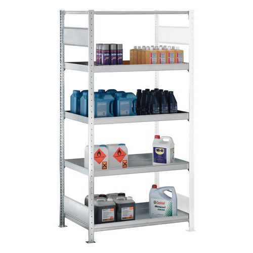 Wichtiger Hinweis: Der Auffangbehälter aus Metall ist kompatibel mit Schadstoffen und/oder brennbaren Stoffen wie Lösungsmitteln, Lacken und Kohlenwasserstoffen. Nicht geeignet für aggressive und korrosive Chemikalien. Das Anbauelement kann nicht alleine installiert werden. Es muss am Ständerrahmen des Grundelements befestigt werden. Die maximal zulässige Belastung bezieht sich auf ein durch einen Träger gleichmäßig verteiltes Gewicht. Hinweis: Regalsystem ausschließlich mit den anderen Regalelementen und Zubehörteilen der Serie Easy-Fix kompatibel.