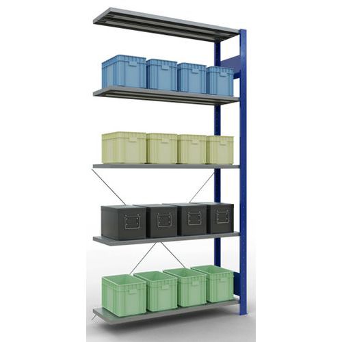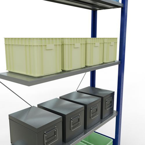 Robustes komplettes Regalsystem mit edler Epoxid-Beschichtung in grau oder blau. Auf den durchgehenden Stahlfachböden können Waren in vielen unterschiedlichen Größen gelagert werden. Einfach und schnell durch Ineinanderstecken aufzubauendes Industrieregal, kein spezielles Werkzeug erforderlich. Einfach erweiterbar mit einem oder mehreren Anbauelementen.