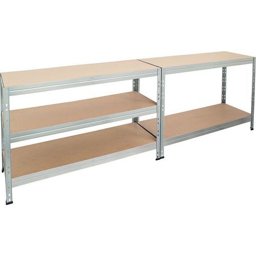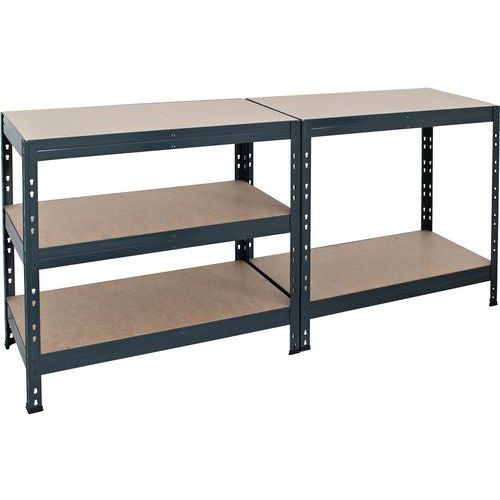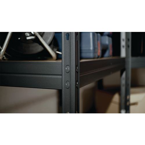 Industrieregal zur Lagerung leichter bis mittelschwerer Lasten, mit 250 kg/Ebene Robust: sichere Befestigung der Streben mit Doppelnietung, 2 Verstärkungen pro Ebene unter den Böden In verschiedenen Größen und 3 hochwertigen Ausführungen (Epoxid-Beschichtung oder verzinkter Stahl) erhältlich. Bei Montage modulierbares Regal: 1 hoher Träger oder 2 niedrige Träger nebeneinander. RAL-Farben: Blau 5010, Anthrazit 7016. HDF-Trägerplatte, sehr hohe Dichte. Lagerregal, sehr einfach zu montieren, keine speziellen Werkzeuge erforderlich.