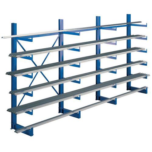 Ein- und doppelseitiges Kragarmregal für die horizontale Lagerung. Fester Halt zur Vermeidung des Herunterfallens von Objekten. Erweiterbar durch eines oder mehrere der Anbauelemente. Kragarmregal mit Schnellmontage durch geschweißte Halterung. Ständerrahmen mit 5 oder 10 fest montierten Armen mit Anschlag. Interasse tra 2 montanti: 1200 mm. Distanza tra 2 bracci: 1225 mm.