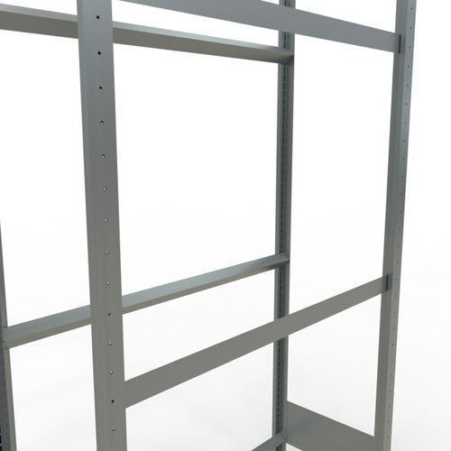 Inhalt: 4 oder 2 Ständerrahmen (Grundelement 4, Folgeelement 2), je nach Regalhöhe 6, 8 oder 10 Streben, komplettes Schraubenset (ohne Bodenbefestigung), 1 Montageanleitung.