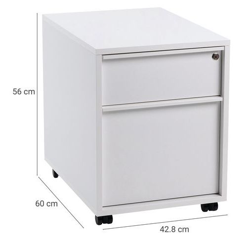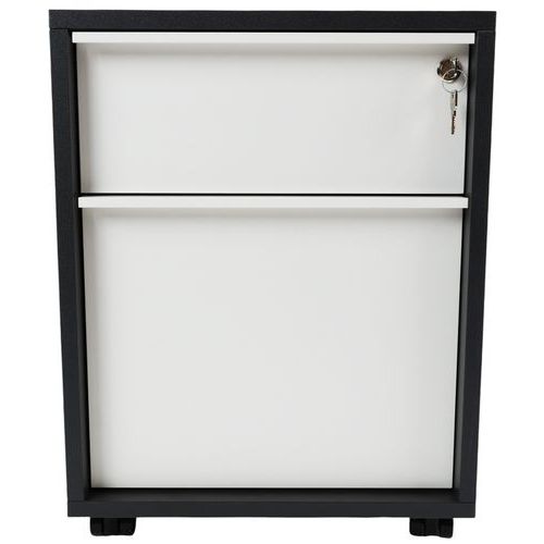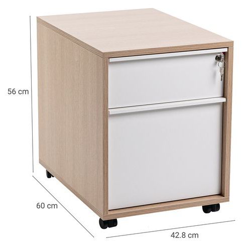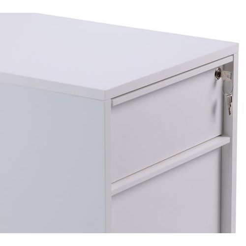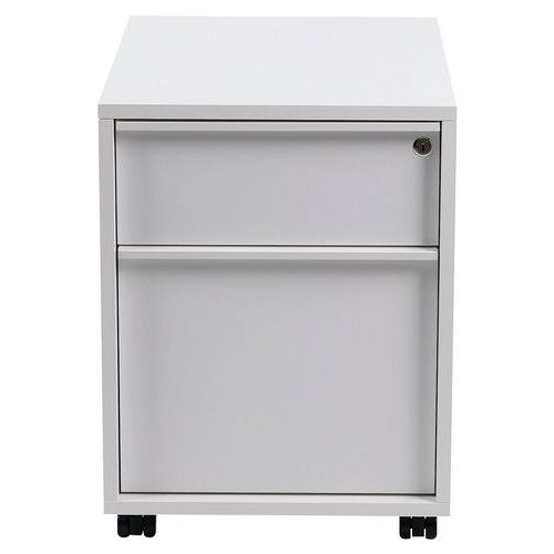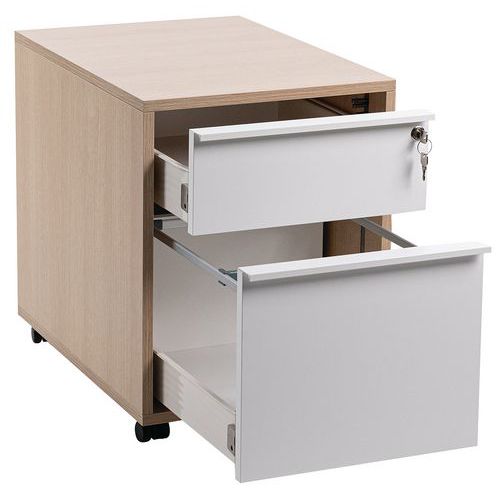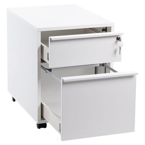 Rollcontainer Misao, melaminbeschichtet, 1-mm-Kanten, 2 Schubladen aus melaminbeschichteter Platte, davon ein Hängeordnerauszug Die Nutzhöhen der Schubladen betragen 14,5 cm und 27,7 cm, und die Nutzbreite liegt bei 32,5 cm Hängeordnerauszug für A4 und Foolscap Zentralverriegelung ohne Kippsicherung