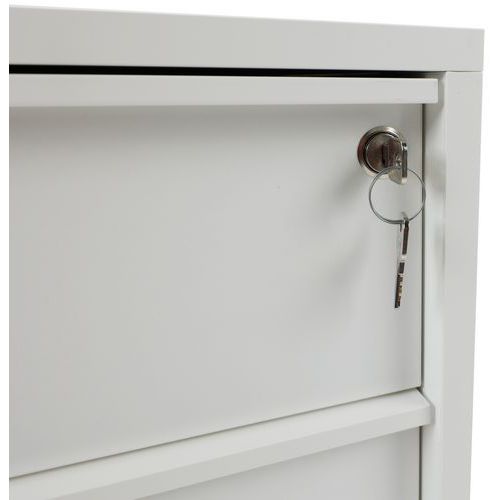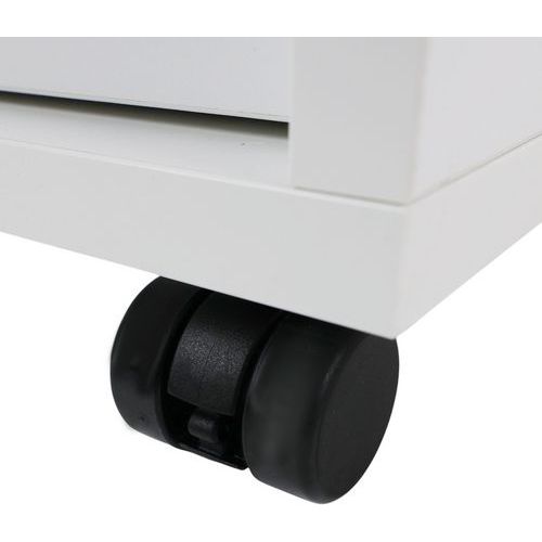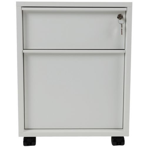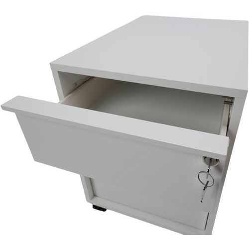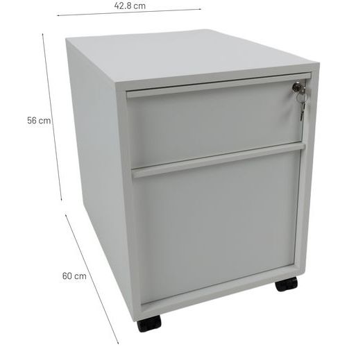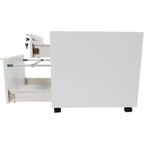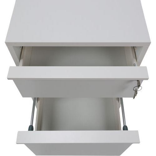 Rollcontainer Misao, melaminbeschichtet, 1-mm-Kanten, 2 Schubladen aus melaminbeschichteter Platte, davon ein Hängeordnerauszug Die Nutzhöhen der Schubladen betragen 14,5 cm und 27,7 cm, und die Nutzbreite liegt bei 32,5 cm Hängeordnerauszug für A4 und Foolscap Zentralverriegelung ohne Kippsicherung Maniglia realizzata in profilo di alluminio anodizzato. Carico massimo per ogni cassetto di 25kg. Ruote piroettanti diametro 37 mm.