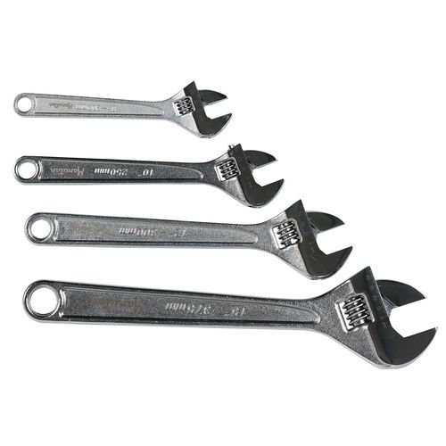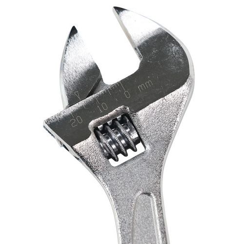 - Rollgabelschlüssel aus Chrom-Vanadium-Stahl, schmaler Kopf mit 15°-Neigung, Einstellung der Schlüsselweite ohne Überstand.