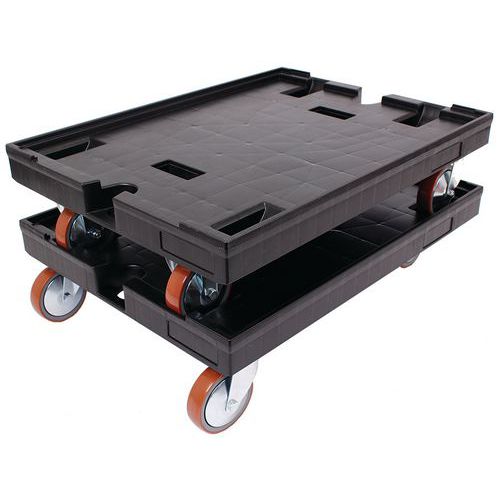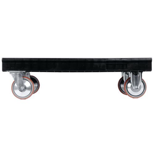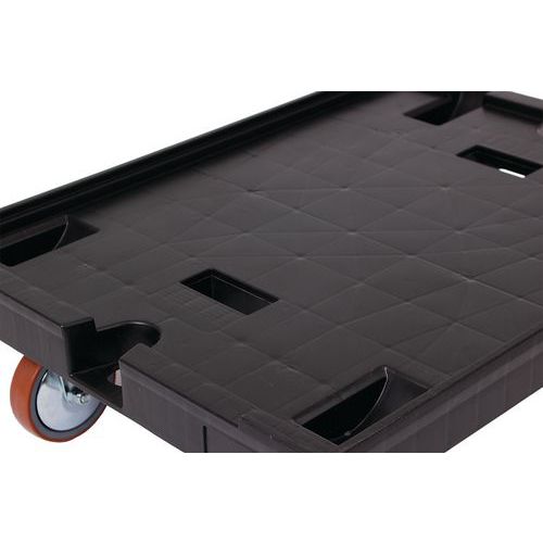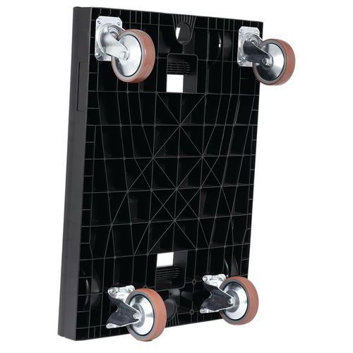 Hohe Stabilität und Tragkraft auch bei schwereren Lasten. Mit 2 Bockrollen und 2 Lenkrollen Abriebfeste, leise Rollfläche Mit Aussparungen auf der Platte zum Aufeinanderstapeln von weiteren Rollplatten Vassoio per arrotolare ultra robusto. Salvaspazio: impilabile quando vuoto.