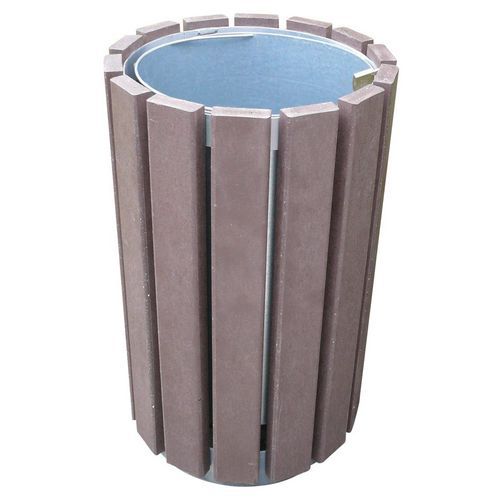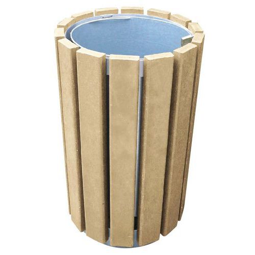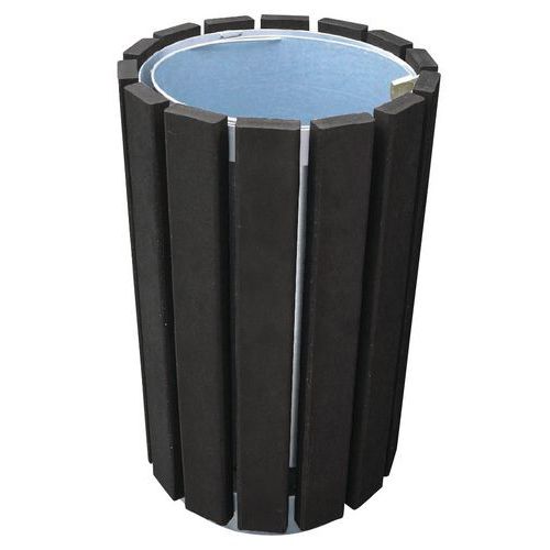 - Runder Abfallbehälter ohne Deckel mit Latten aus recyceltem Kunststoff mit einer Dicke von 30 mm.