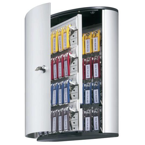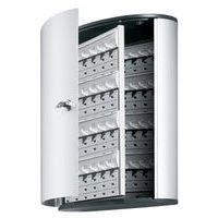 Ansprechender Schlüsselschrank für Schlüsselhalter Key Clip. Passt sich durch höhenverstellbare Leisten an die Schlüsselgröße an. Funktional, Tür öffnet bis 90°. Verschluss durch Sicherheitsschloss gewährleistet.