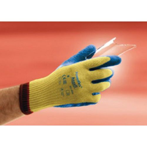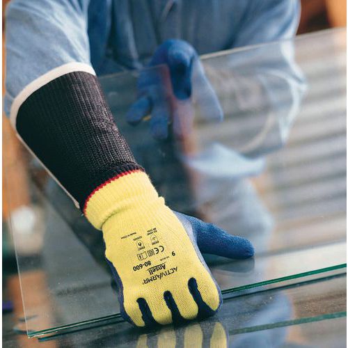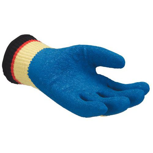 Die Kombination einer Beschichtung mit Naturkautschuk-Latex und eines gestrickten Kevlar®-Futters ermöglicht diesen abriebfesten Handschuhen die Erfüllung der Normen ANSI A2/EN ISO C hinsichtlich des Widerstands gegen Schnitte, so können Arbeiter sowohl Glas als auch Metall und Kunststoffe sicher handhaben