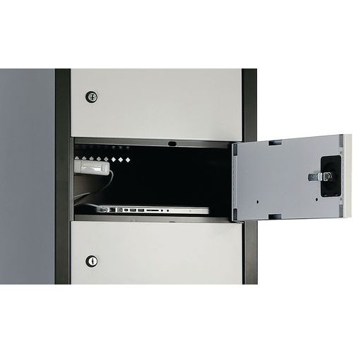 Schrank aus Stahl mit internem PC-Anschlusssystem.