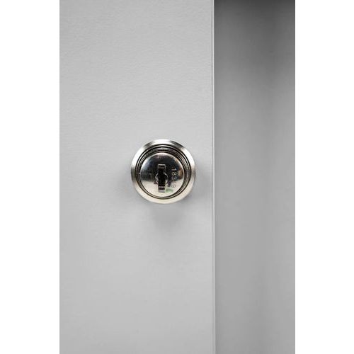 Melaminbeschichteter Schrank mit Schiebetüren, Stärke 18 mm, mit 1-mm-ABS-Kanten. Das Regal von 25 mm Stärke kann eine Last von bis zu 32 kg tragen. Kunststoff-Stellfüße zum Nivellieren Ihres Schranks. 60-mm-Metallprofilgriff. Mit Schlüssel verschließbar.