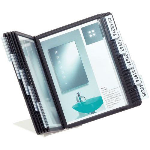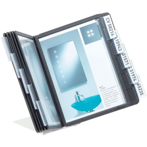 | Produktname | Schreibtischhalterung Vario - 10 schwarze Sichttafeln A5, Haltermaterial: Stahl, Anzahl Hüllen: 10 |