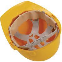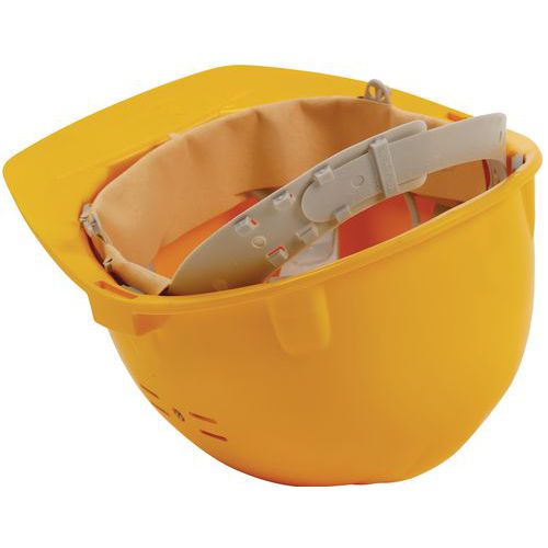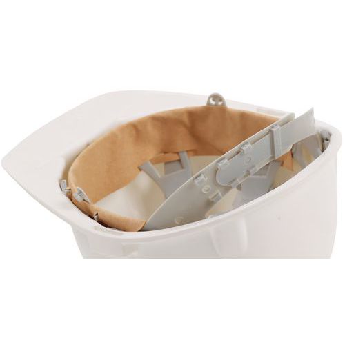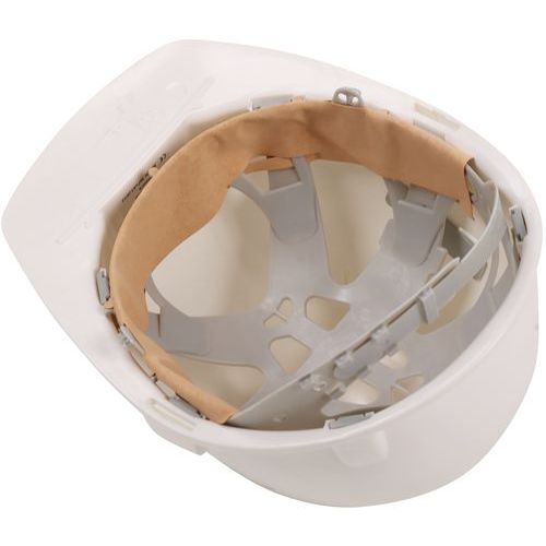 Schutzhelm aus HDPE mit UV-Schutz-Behandlung, verstellbar durch Riemenband Rückverfolgbarkeit: Herstellungsdatum und Losnummer sind unter dem Visier angegeben