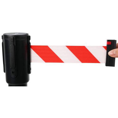 Pfosten mit ausziehbarem Gurtband und 3 Befestigungspunkten. Bandeinzug mit automatischer Abbremsung für sanftes Einziehen beim Aushängen des Gurtbands. Sockel mit Gummischutz für mehr Stabilität.