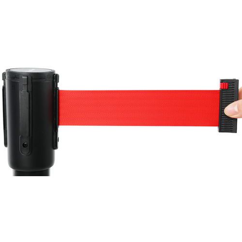 Pfosten mit ausziehbarem Gurtband und 3 Befestigungspunkten. Bandeinzug mit automatischer Abbremsung für sanftes Einziehen beim Aushängen des Gurtbands. Sockel mit Gummischutz für mehr Stabilität.