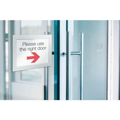Selbstklebender Info-Rahmen Duraframe® für glatte Oberflächen Mit der selbstklebenden, neu positionierbaren Rückseite lässt sich der Rahmen auf allen glatten, starren Oberflächen wie Wänden, Türen usw. anbringen und wieder davon lösen. Auf Glasflächen kann sowohl die Vorder- als auch die Rückseite des Dokuments gelesen werden Einfache und schnelle Aktualisierung und guter Halt von Dokumenten dank Magnetrahmen Verwendbar im Hoch- oder Querformat Ideale Lösung zum Aushängen von allgemeinen und obligatorischen Unternehmensinformationen, Werbungen, internen Reglements, informativen Hinweisen usw.