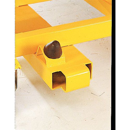 Auf Rollen mit Polyurethanlauffläche, Durchmesser 16 mm (2 feste, 2 Lenkrollen) mit Schiebebügel und Roll-On/Roll-Off-System vorn.