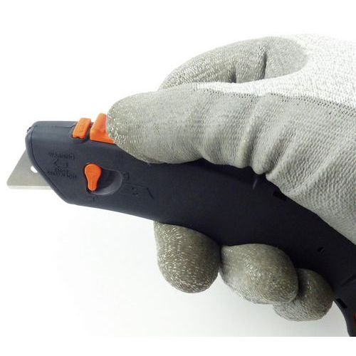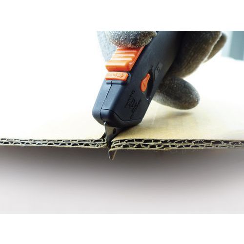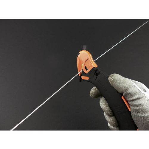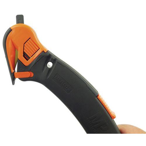 Mehrzweck-Sicherheitsmesser, 4-in-1: Merlot 2 Ideal geeignet für das Schneiden von Karton, Plastikfolie, PVB, Gurtband, Drähten und Schnüren Dank des Kunststoffhakens an der Vorderseite lassen sich Klebestreifen von Verpackungen leicht durchreißen Eine Sicherheitsvorrichtung verhindert, dass beide Klingen gleichzeitig benutzt werden Automatisches Einziehen der hinteren Klinge Wechseln der Klingen möglich Hintere Klinge aus Edelstahl und vordere Klinge TIN-beschichtet Hergestellt in Frankreich