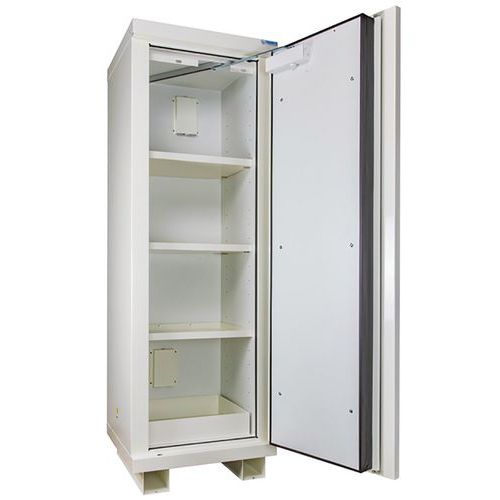 Sicherheitsschrank, Verriegelung mit Schlüssel. Griff über die gesamte Höhe des Schranks, für ergonomischere Handhabung und leichteres Öffnen. Lüftungsöffnungen für den Anschluss an eine Belüftung. Fachböden im Raster von 6,4 cm verstellbar. Entspricht den Normen EN14470-1 und FM 6050. Guarnizioni porta termodilatanti. Punto di collegamento a terra. Resistenza al fuoco di 90 minuti e testato fino a 105 minuti.