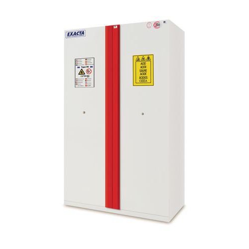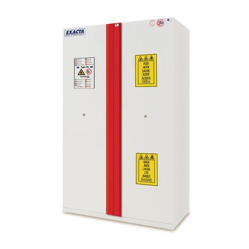 Armadio a 1 porta/2 scomparti comprendente: - 1 scomparto per materiali infiammabili con 1 ripiano in acciaio verniciato + 1 vassoio di ritenzione con griglia - 1 scomparto acido/base con 3 ripiani in acciaio verniciato. Armadio a 1 anta/3 scomparti comprendente: - 1 scomparto per materiali infiammabili con 1 ripiano in acciaio verniciato + 1 vassoio di ritenzione con griglia - 1 scomparto per acidi con 2 ripiani in acciaio verniciato - 1 scomparto base con 1 ripiano in acciaio inossidabile. Armadio a 2 porte/2 scomparti comprendente: - 1 scomparto per materiali infiammabili con 3 ripiani in acciaio verniciato + 1 vassoio di ritenzione con griglia - 1 scomparto per acido/base con 3 ripiani in acciaio verniciato. Armadio a 2 porte/3 scomparti comprendente: - 1 scomparto per materiali infiammabili con 3 ripiani in acciaio verniciato + 1 vassoio di ritenzione con griglia - 1 scomparto per acidi con 2 ripiani in acciaio verniciato - 1 scomparto base con 2 ripiani in acciaio inossidabile. A