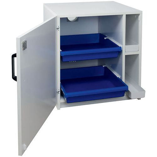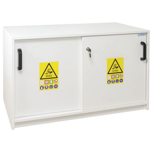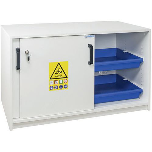 Sicherheitsschrank mit Fächereinteilung zur getrennten Aufbewahrung von Säuren und Basen. Stellfüße zur Höhenanpassung. Auffangwanne aus Polypropylen auf Gleitschienen. Die Konstruktion ist beständig gegen korrosive Dämpfe. Lüftungsöffnungen für den Anschluss an eine Belüftung. Erfüllt die Empfehlungen des französischen Sicherheits- und Forschungsinstituts INRS.