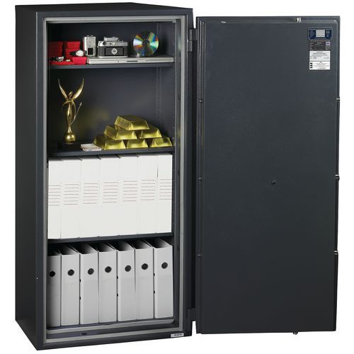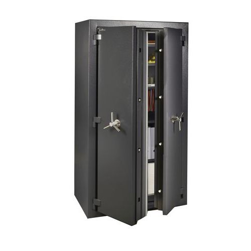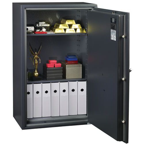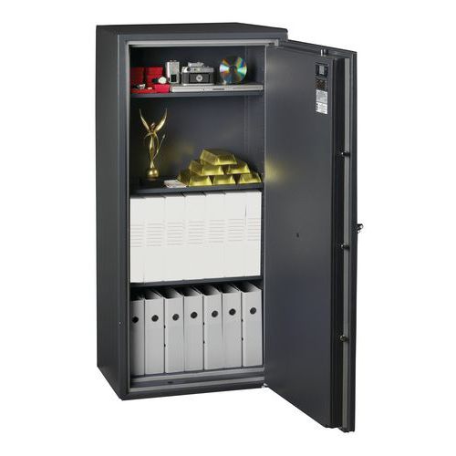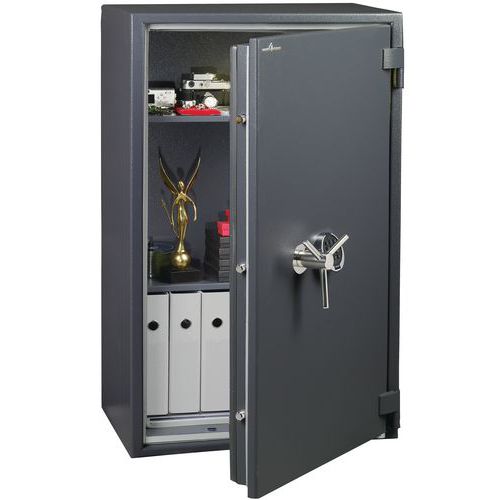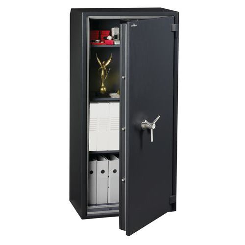 Feuerfester Schrank 1 Std. Türöffnung bis 200°. Manganverkleidung mit Anbohrschutz. Consegna su appuntamento con installazione presso la sede del cliente con ritiro degli imballi per il riciclaggio. Piano terra con massimo 2 gradini o piano superiore con ascensore. Massimo 20 metri di percorrenza. Per eventuali richieste di consegna particolari, contattare il nostro Servizio Clienti (accesso difficile, pendenza ripida, terreno soffice).
