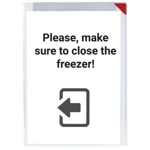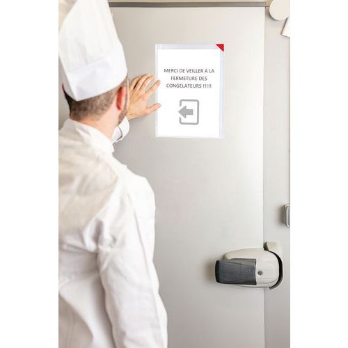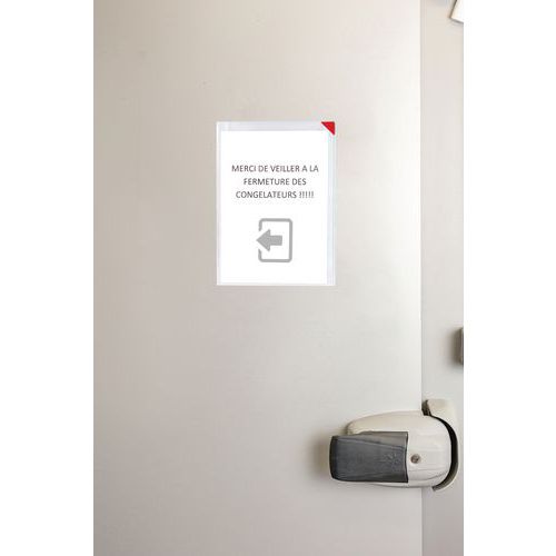 Proprietà antiriflesso. Chiusura angolare magnetica con stampa angolare rossa. 2 larghe strisce adesive in schiuma sul retro. Da utilizzare in modalità verticale o orizzontale. Può contenere fino a 10 fogli di carta da 80 g.