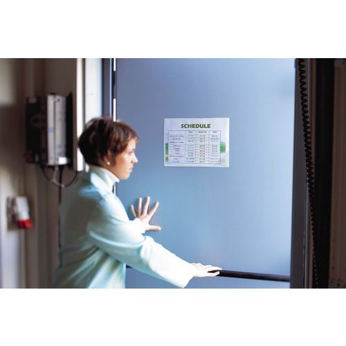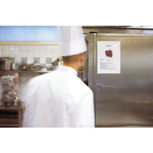 Magnetische Sichttafel Kang lässt sich an allen metallischen Oberflächen befestigen Rückseite komplett magnetisch, tadellose Beständigkeit Öffnung an 2 Seiten für ein einfaches Einführen von Dokumenten. Eckverschluss Easy Load zum praktischen und effizienten Einführen und Herausnehmen von Dokumenten Verwendung im Hoch- und Querformat Einfache und schnelle Installation, ohne Schrauben oder Nägel. Lässt sich ablösen, ohne Spuren zu hinterlassen. Utilizzo in verticale e in orizzontale. Soluzione espositiva per l'utilizzo su macchine, porte, tavole metalliche, frigoriferi, ecc. Tasca in PVC con retro magnetico. Può contenere fino a 10 fogli di carta da 80 g. Fondo completamente green. Hergestellt in der EU