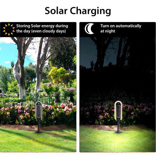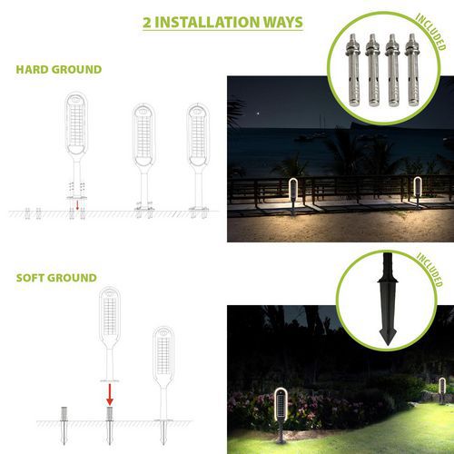 2 Gebrauchsmodi: Bewegungssensor-Modus: Die Lampe schaltet sich nachts automatisch ein Sie schaltet sich mit voller Helligkeit (400 lm) ein, wenn eine Bewegung im Umkreis von 7 Metern erkannt wird, und reduziert anschließend die Helligkeit nach 20 Sekunden ohne Bewegung Dauerlicht-Modus: Die Leuchte schaltet sich nachts automatisch ein und leuchtet mit einer Lichtleistung von 50% Nach 5 Stunden (oder wenn die Akkuladung geringer als 30% ist) schaltet die Leuchte wieder in den Bewegungssensor-Modus Die Leuchte ist mit SMD-LEDs der neuesten Generation und mit einem leistungsstarken Diffusor ausgestattet: Das Licht ist homogen Licht mit 4000 K: weder Kalt- noch Warmlicht 2 Befestigungsarten: mit Schrauben oder Erdspieß (beides im Lieferumfang enthalten)