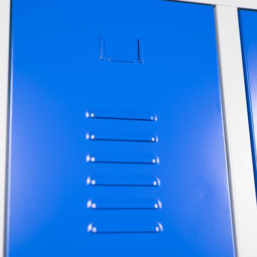 Spezieller, robuster Lagerspind für saubere Industrieumgebungen, wird vollständig flach verpackt und demontiert geliefert Langlebige Metallkonstruktion mit elektrostatischer Pulverbeschichtung Verstärkte Tür mit verdeckten Scharnieren und geräuschhemmendem Kunststoffstopper. Tür mit doppelten Luftschlitzen zur Luftzirkulation und mit geprägtem Etikettenhalter Spogliatoio comodo da usare con ampia apertura della porta a 115°.