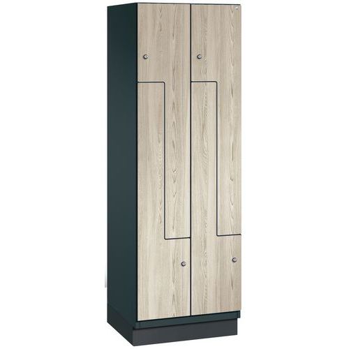 Spind mit Holztüren in L-Form – 2 bis 6 Fächer, Breite 150 mm – auf Sockel