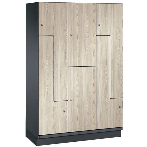 Spind mit Holztüren in L-Form - 6 Fächer, Breite 300 und 400 mm - auf Sockel - CP