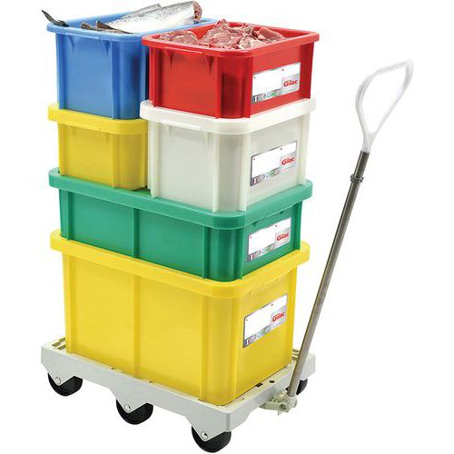 Stapelbarer Behälter mit Deckel gemäß HACCP-Konzept für die Lagerung von Lebensmitteln. Zuverlässige und leicht zu entfernende Beschriftungen durch integriertes IML-Etikett. Zur besseren Handhabung sind die Griffe nach innen versetzt. Ohne Deckel stapelbar. Design senza zona di ritenzione. Lavabile in lavatrice. Compatibile con tutti i passi Gilac 4 e 6.