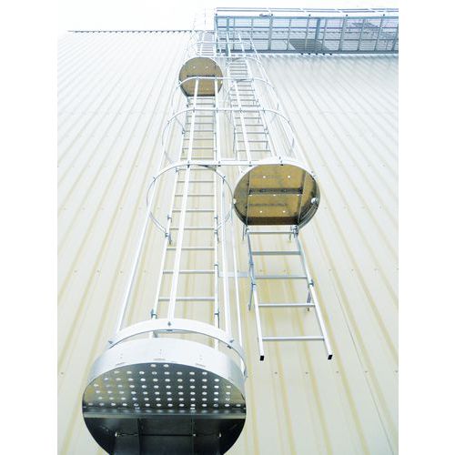 Anpassbare Sicherheitsleiter für alle Gebäudemaße. Aluminiumlegierung: optimales Kraft-Gewicht-Verhältnis Einfache und schnelle Montage und Anbringung. Mit Korrosionsschutz, leicht zu reinigen. Scala con interasse pioli 280 mm. Uscita frontale con crinolina larghezza 1300 mm. Kundengarantie : 5 Jahre
