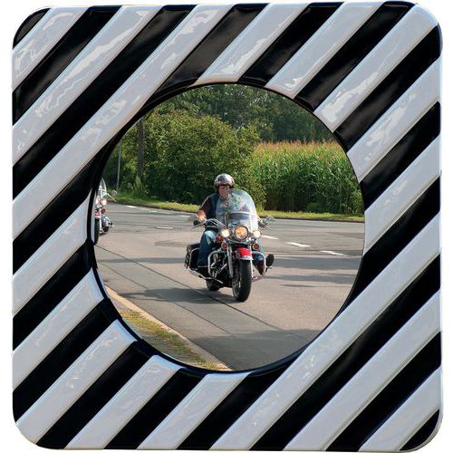 Straßenspiegel zur Erhöhung der Sicherheit und Verringerung von Gefahren in potenziell gefährlichen Bereichen, weiß-schwarzer Rahmen, entspricht dem Erlass vom 21.09.1981 Metallisierte Spiegelfläche für eine hervorragende Bildwiedergabe ohne Verzerrung Sehr widerstandsfähig: getestet auf Windstärke 12 (Orkan von mehr als 117 km/h) 4-Punkt-Kugelgelenkhalterung zur Befestigung an Wand oder Pfosten, stabiler als eine klassische Befestigung Acryl-Ausführung mit höherer Stoßfestigkeit als Glas