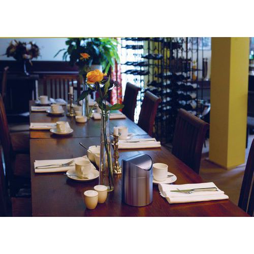 | Produktname | Tischabfalleimer, Gesamtinhalt: 1.5 L, Öffnung: Mit Pedal, Werkstoff: Metall, Werkstoff: Edelstahl |