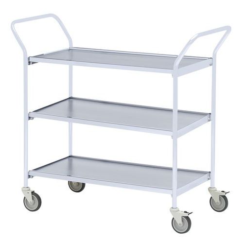 Tischwagen mit grauem Rahmen, 3 Platten und 2 Lenkgriffe.