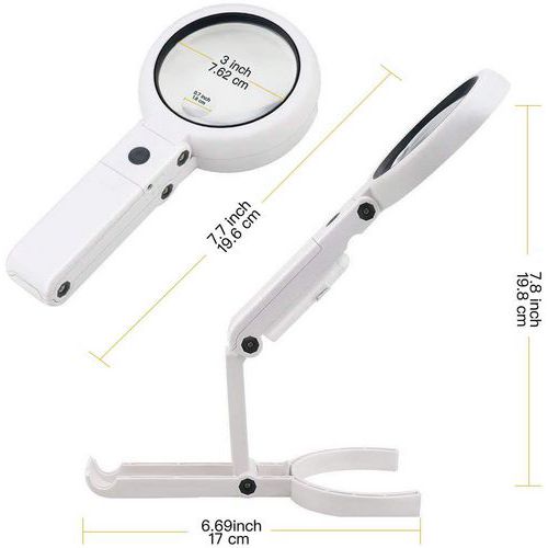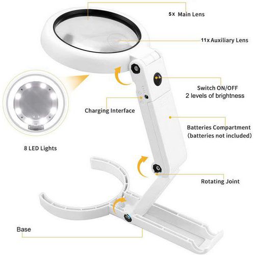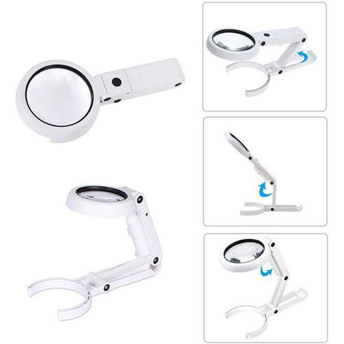 Diese Lupe kann auf zwei Arten verwendet werden: Sie kann wie eine normale Lupe in der Hand gehalten oder aufgeklappt und wie eine Lampe auf den Tisch gestellt werden