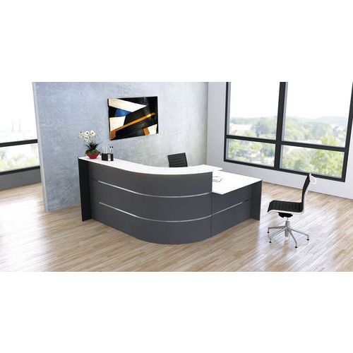 Tresen für den Empfangsbereich mit niedrigem Tischelement bestehend aus einem runden und einem geraden Element. Tresen für den Empfangsbereich mit niedrigem Tischelement Bari, modulares Element aus Holz/Stahl. Melaminbeschichtete Holzplatten mit ABS-Kanten. Integrierte Kabelkanäle. Front mit Zierbändern aus Edelstahl. Compatibile con il modulo di espansione docking Bari. Le viti sono incluse Instradamento dei cavi incluso.