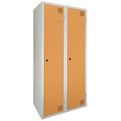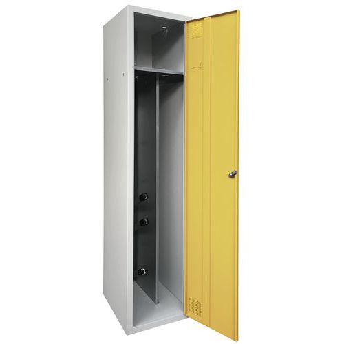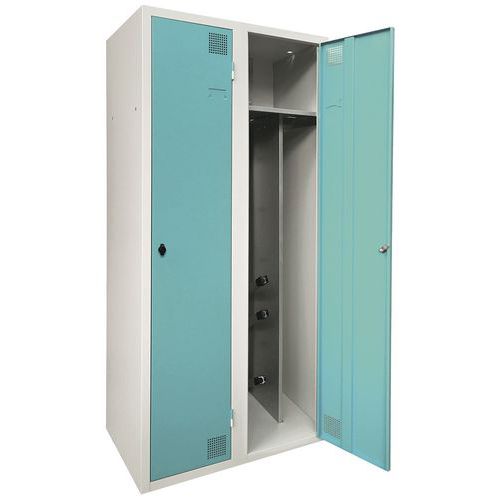 Warmluft-Trocknungsschrank, sehr robust, mit Fächern und Doppelgarderobe. Garderobe mit zwei Fächern: separates Verstauen von sauberer/schmutziger Kleidung. Korpus und Tür aus elektroverzinktem Blech mit Verstärkung über die gesamte Höhe. Hoher Bedienkomfort durch Scharniersystem, das einen Öffnungswinkel von 180 ° bietet. Hygienisch mit einer doppelten Belüftung an der Vorderseite im oberen und unteren Bereich des Spinds. Edle Ausführung mit lackierter Epoxid-Beschichtung, in vielen attraktiven Farben erhältlich. 2 chiusure a scelta: serratura a chiave o chiusura a lucchetto. Guardaroba con porta etichette. Prodotto fabbricato in Francia.