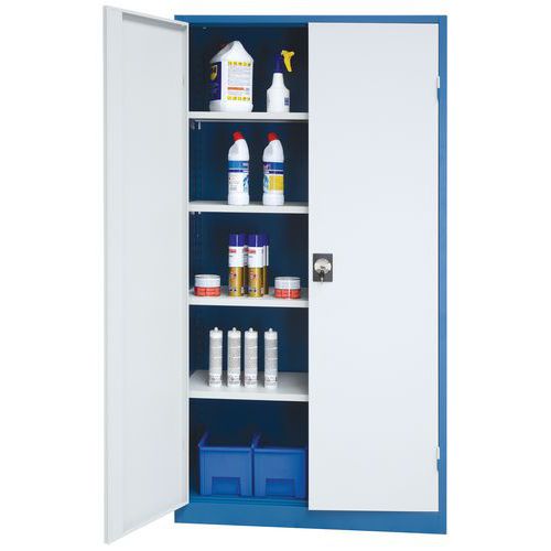 Werkstattschrank aus solidem Material aus verschweißtem Stahl mit Flügeltüren Bestimmen Sie selbst die Höhe Ihrer Fachböden in Schritten von je 36 mm Mittels Schloss leicht abzuschließen