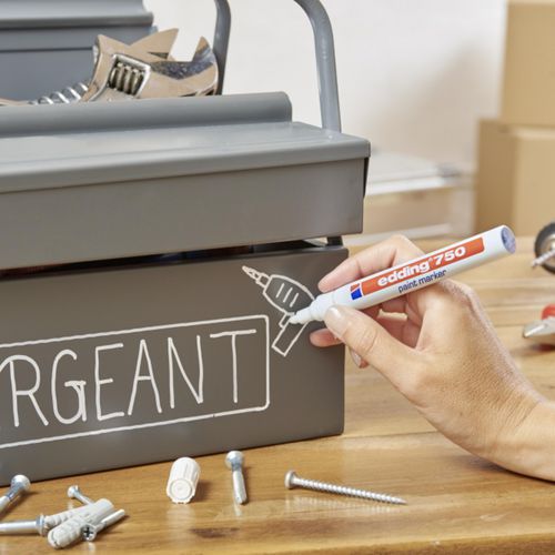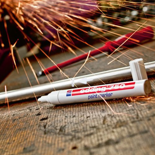 Farbmarker - Edding 750 für eine sehr gut deckende und permanente Markierung, selbst auf dunklen und durchsichtigen Materialien. Markierung auf Metall, Glas, Kunststoff usw. und insbesondere auf allen glatten Oberflächen. Schnelles Trocknen der Farbe, geruchlos. Widerstandsfähig gegenüber Wasser, Licht, Hitze bis 400° C (1000° C für bestimmte Farben wie Weiß, Gelb, Silber) und abriebbeständig. Tintenfluss wird durch das Ventil am Stift gesteuert.
