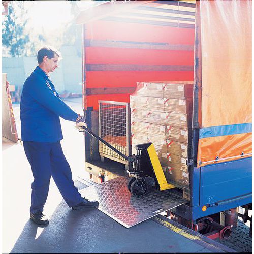 | Produktname | Verladerampe, Werkstoff: Aluminium, Max. Belastung: 1200 kg, Gesamtbreite: 1250 mm, Gesamtlänge: 750 mm |