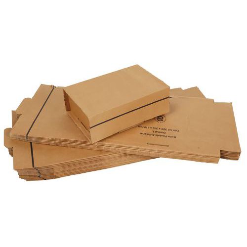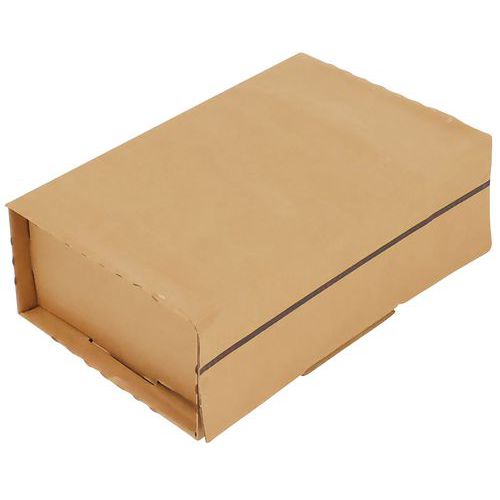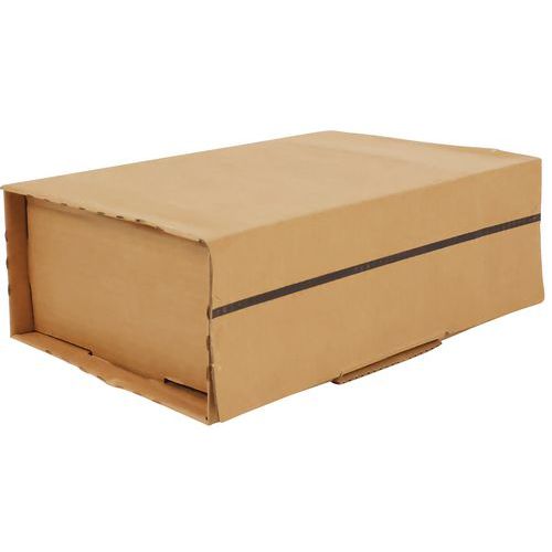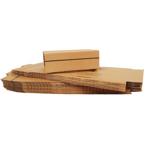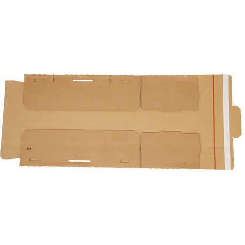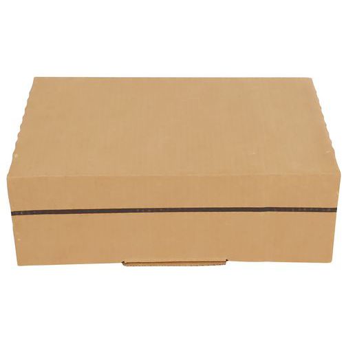 Versandbox mit sicherem Verschluss durch Klebstreifen und umlaufenden Kanten- und Eckenschutz. Gebrauchsfertig, es wird kein weiteres Klebeband benötigt. Box aus einwelligem Karton, einfach aufzubauen.