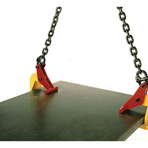 Hebezubehör für waagerechte Platten. Zange mit Kipphebel zum Verriegeln der Last. Die in der Zange platzierte Last wird beim Heben verriegelt. Kompakt und besonders leicht.