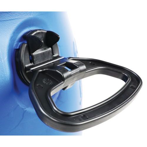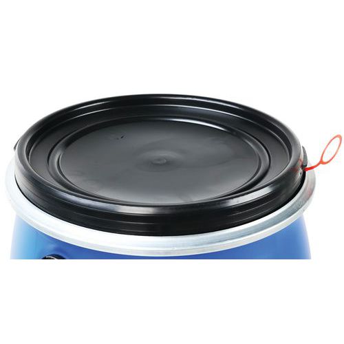 Zylinderförmiges HDPE-Fass für gesicherte Lagerung und Transport Deckel mit Dichtung und Spannring aus verzinktem Stahl und verplombbarem Hebelverschluss UN-Zulassung für den Transport von Gefahrenstoffen Schwarzer Deckel mit EPDM-Dichtung Die 120-L- und 200-L-Modelle sind nicht mit Griffen ausgestattet