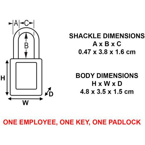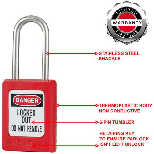 Vorhängeschloss aus Thermoplastik und Bügel aus Edelstahl 316 mit einem Durchmesser von 4,76 mm für mechanische Anlagen Geeignet für ATEX-klassifizierte Standorte und Bereiche Mit Rückhaltung des Schlüssels Feiner Bügel für vielseitigere Einsatzmöglichkeiten Denken Sie an den LIFEGUARD-Service: Kostenloser Registrierungsservice für Schlüsselnummern, die von einem Unternehmen verwendet werden, um sicherzustellen, dass keine doppelten Schlüssel in Ihren Teams vorhanden sind Bitte teilen Sie uns dies bei der Bestellung mit
