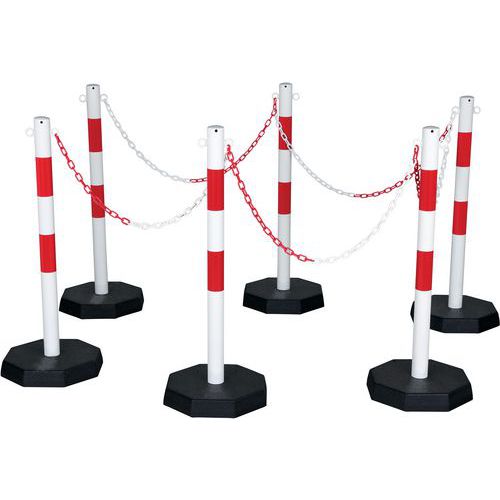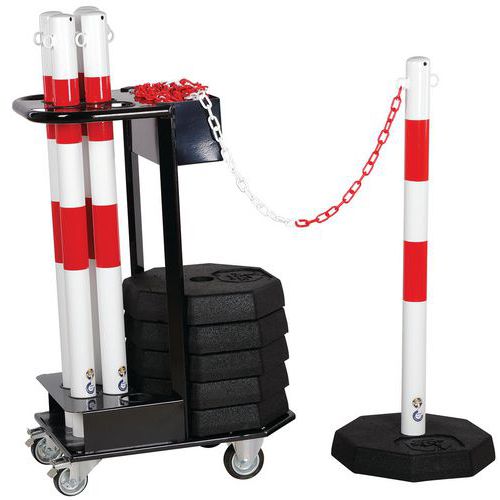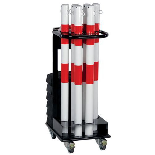 Wagen und Pfosten aus Stahl: erleichtert den Transport und die Aufbewahrung der Pfosten Durch die Konstruktion aus verzinktem Stahl ist die Verwendung im Innen- und Außenbereich möglich Gute Sichtbarkeit dank zweifarbiger Optik Sehr einfache Installation TÜV-zertifiziert