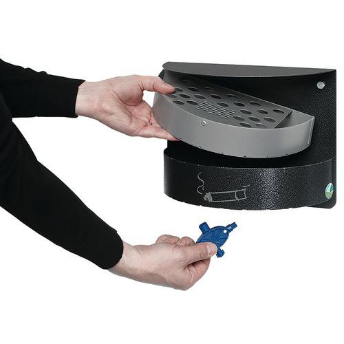 Wandaschenbecher für den Außenbereich mit Schutzdeckel gegen Regen. Sehr witterungsbeständig dank UV-beständiger Epoxid-Pulverbeschichtung. Robust: langlebige, hochwertige Konstruktion aus verzinktem Stahlblech. Einfach zu leerender Aschenbecher mit Doppelbartschlüssel (1 Schlüssel) gesichert, Diebstahlsicherung.
