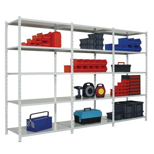 Stabiles Regal mit geschlossenen Fachböden aus Blech für lose Waren und Gegenstände. Einfacher Aufbau mit Direktverriegelung der Böden an den Ständerrahmen. Ohne Kreuzverband und Rücken an Rücken installiert für eine doppelseitige Verwendung. Die Fachböden können jederzeit montiert oder entfernt werden, ohne das Regal zu destabilisieren. Conserva tutti i tuoi prodotti sfusi!