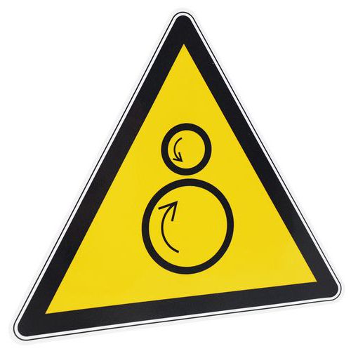 - Dieses Schild mit Piktogramm ist also besonders gut dazu geeignet, auf eine Gefahr durch gegenläufige Rollen hinzuweisen